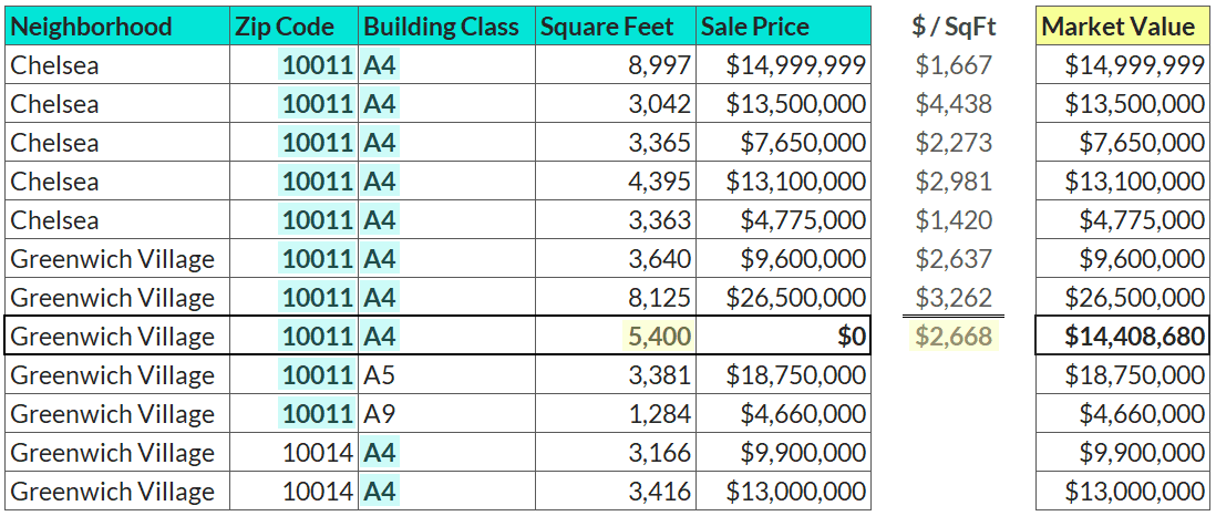 Your task is create a new market value column that uses the recorded sale price when available, or estimates it by using the average price per square foot from properties within the same zip code and building class.