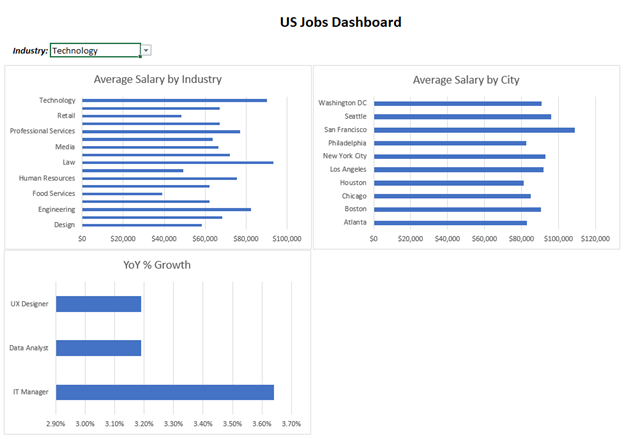 As an example, consider you are a high school guidance counselor who wants to help seniors choose a university and degree. You’ve obtained data from Glassdoor, the job and recruiting website, and want to put together a dashboard that highlights the job landscape in different industries and cities across the country to help your students make an informed decision.