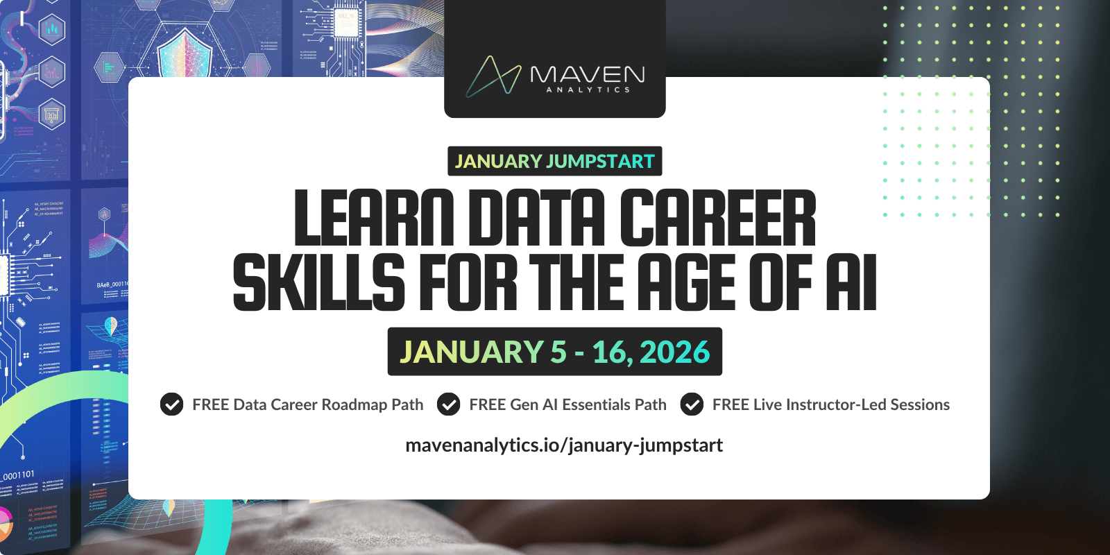 Join us January 5th - 16th to jumpstart the new year with LIVE instructor-led learning sessions and FREE course access to our top career & AI learning paths. Let’s make AI your new data superpower in 2026!